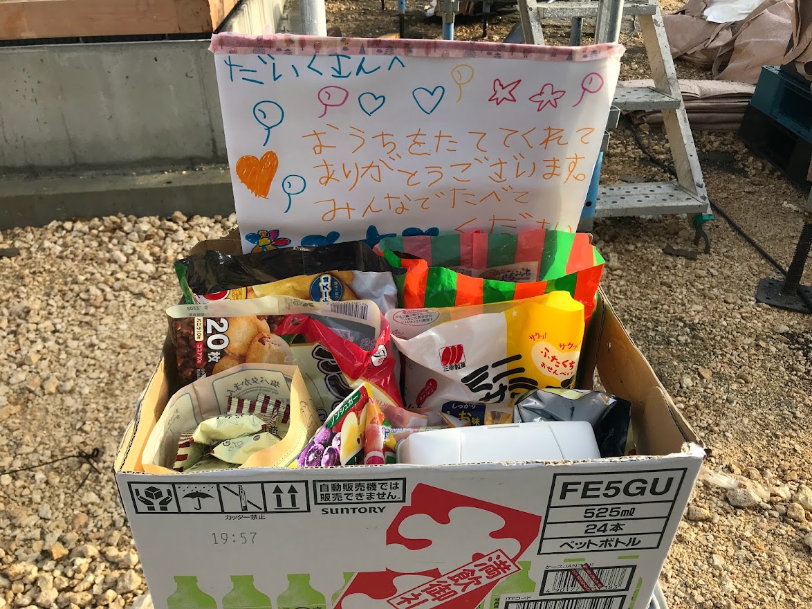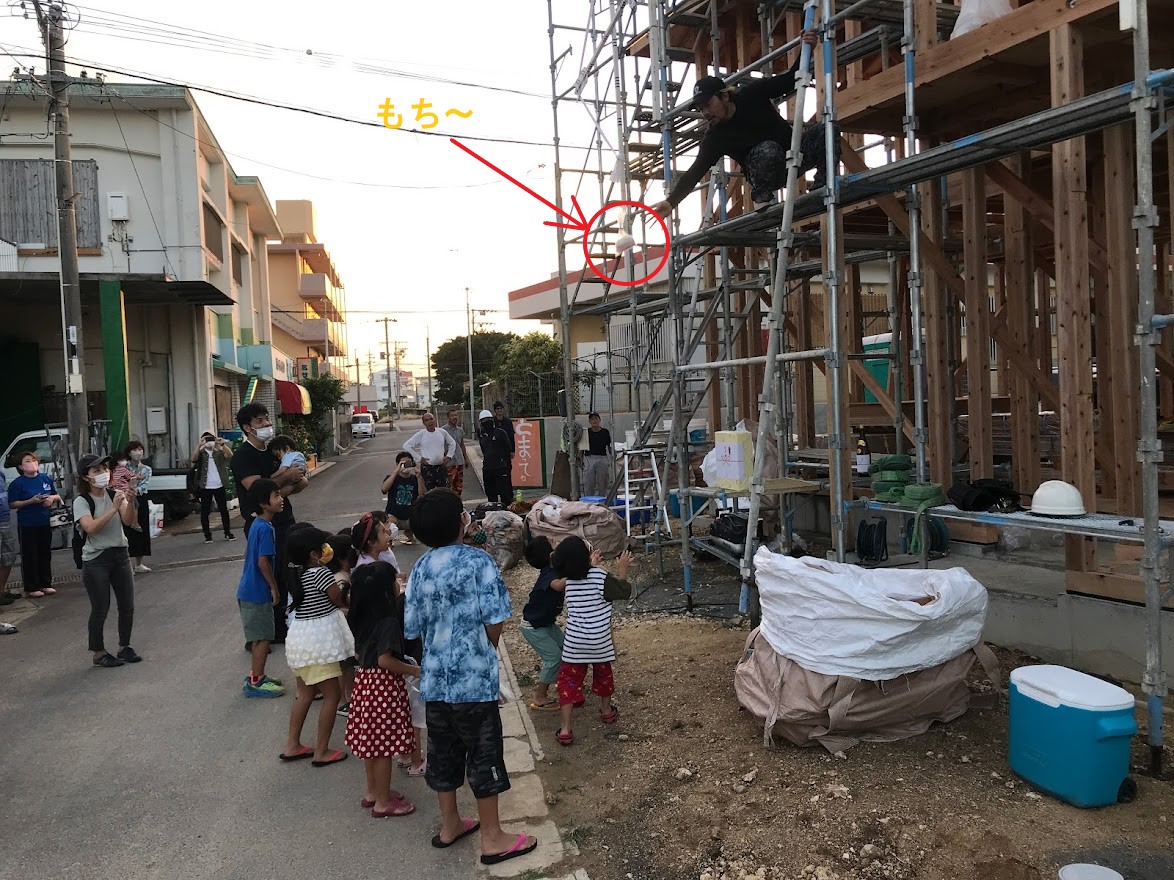 石垣島お住まい情報 スタッフブログ 2021.11.10 水曜日の石垣島お住まい情報今週は! 先週末棟上げがありましてほっこりしたのでアップします 朝現場につきましたらお客様の子供さんの手作り休憩 お菓子置き場 やる気満々になりました 夕方からは上棟式とお餅撒き大会 子供たち我先に!頑張っています 取れない子供さんの為に大工さん優しくトス お子供さんたちも良い思い出になったことでしょう(^^♪ ではまた来週!!