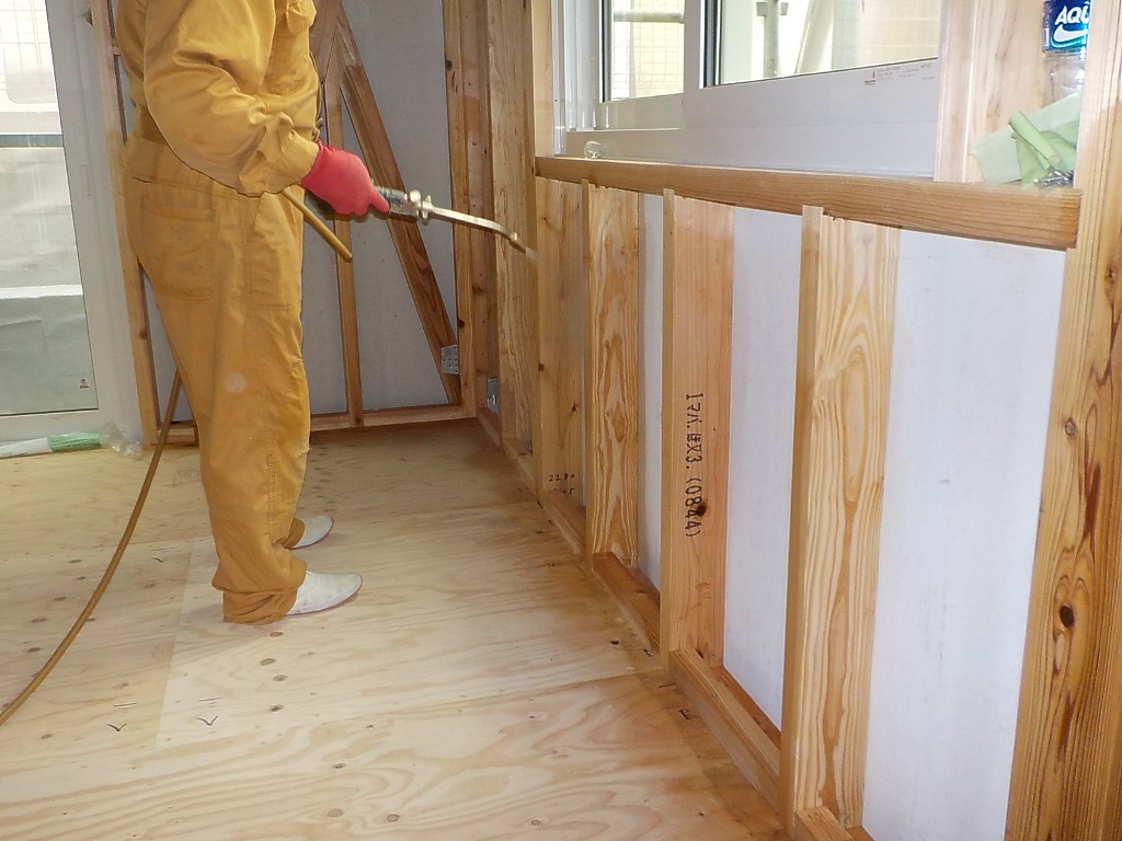 そして、木造の躯体が立ち上がった後に地面から約1mの高さまで、直接、柱や床の木材に防蟻処理剤を撒きます。