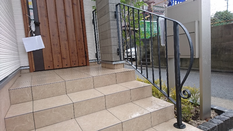 C棟の玄関ポーチと植栽です。こちらも同じくアイアンのフェンス手摺を取り付けました。