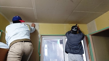 1階では、左官さんが室内に天然塗り壁を塗る前の石膏ボードの継ぎ目にひび割れ防止にメッシュテープを