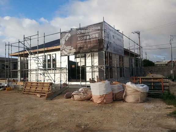 とっても丁寧できれい好きな金城大工により、1号地のサッシおよび外部防水シートが貼り終わりました。