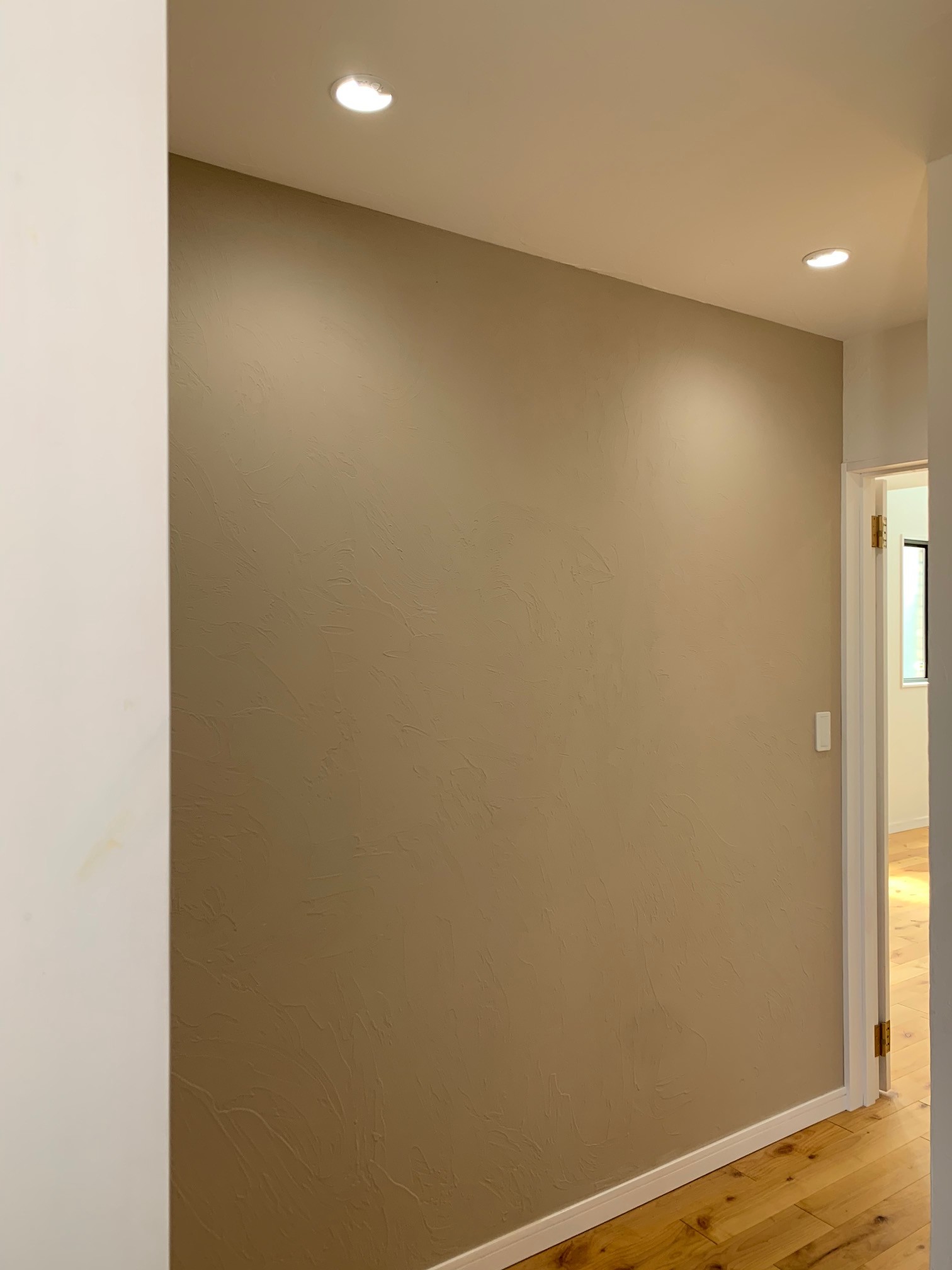 オシャレカラーリングで天然無垢材を使用した床材と同調した玄関ホールから覗くリビング