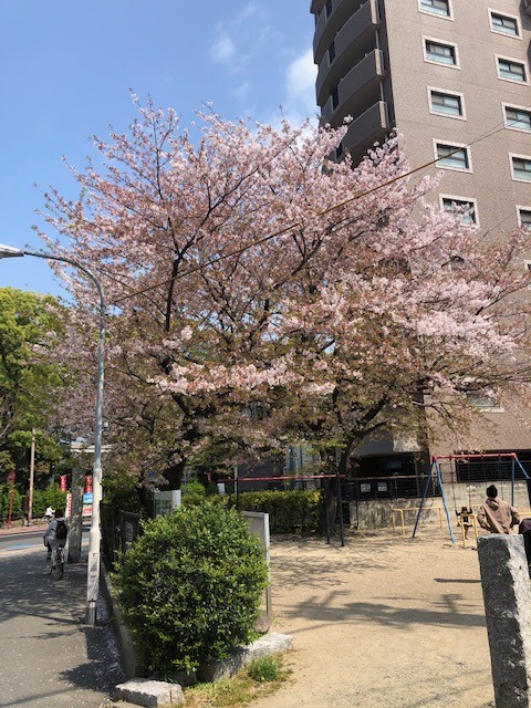 本日も、福岡は快晴で、桜も新芽の緑と、花びらの桃色のコントラストが青空にとてもはえています。